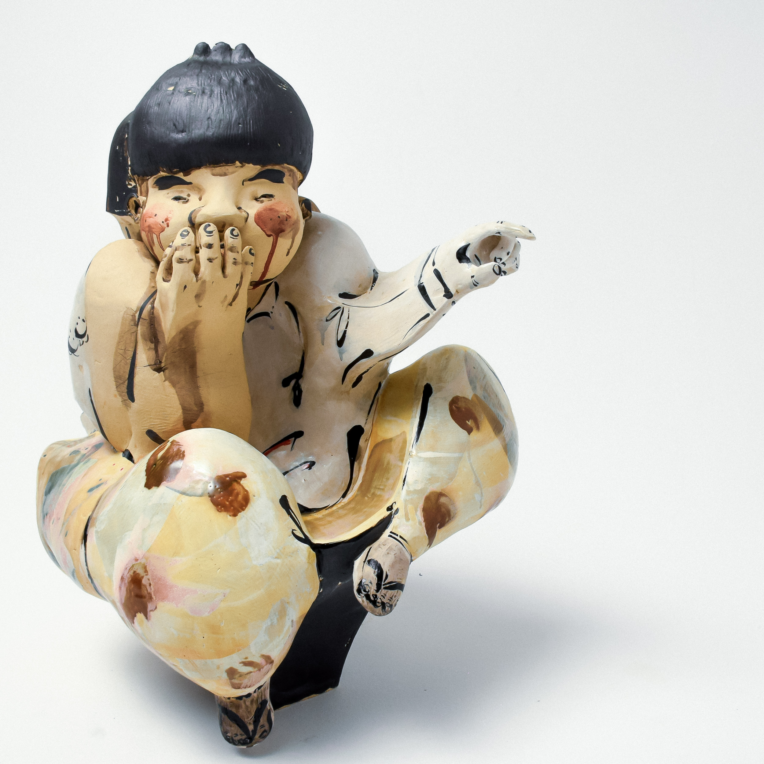 Saying Hi Is That Hard | Stoneware, glaze, colour slip, poly China silk | 25 x 11.5 x 15.5 in (63.5 x 29.2 x 39.4 cm)