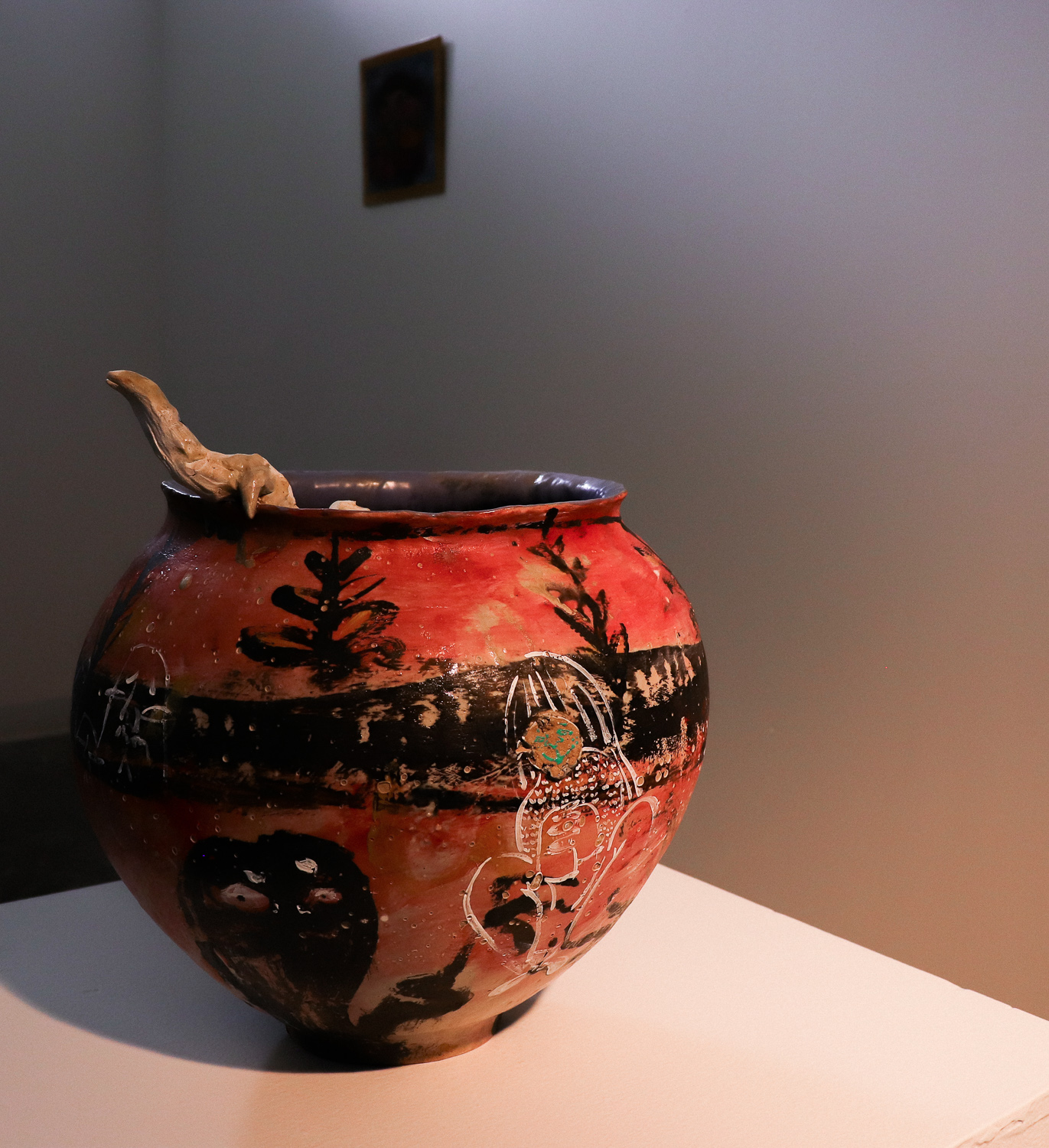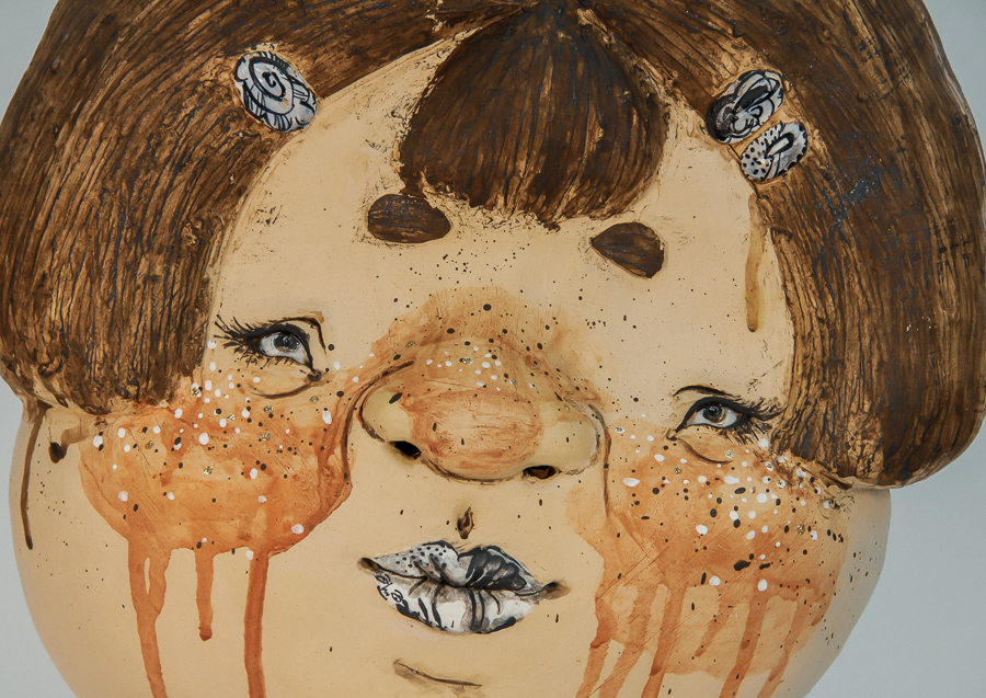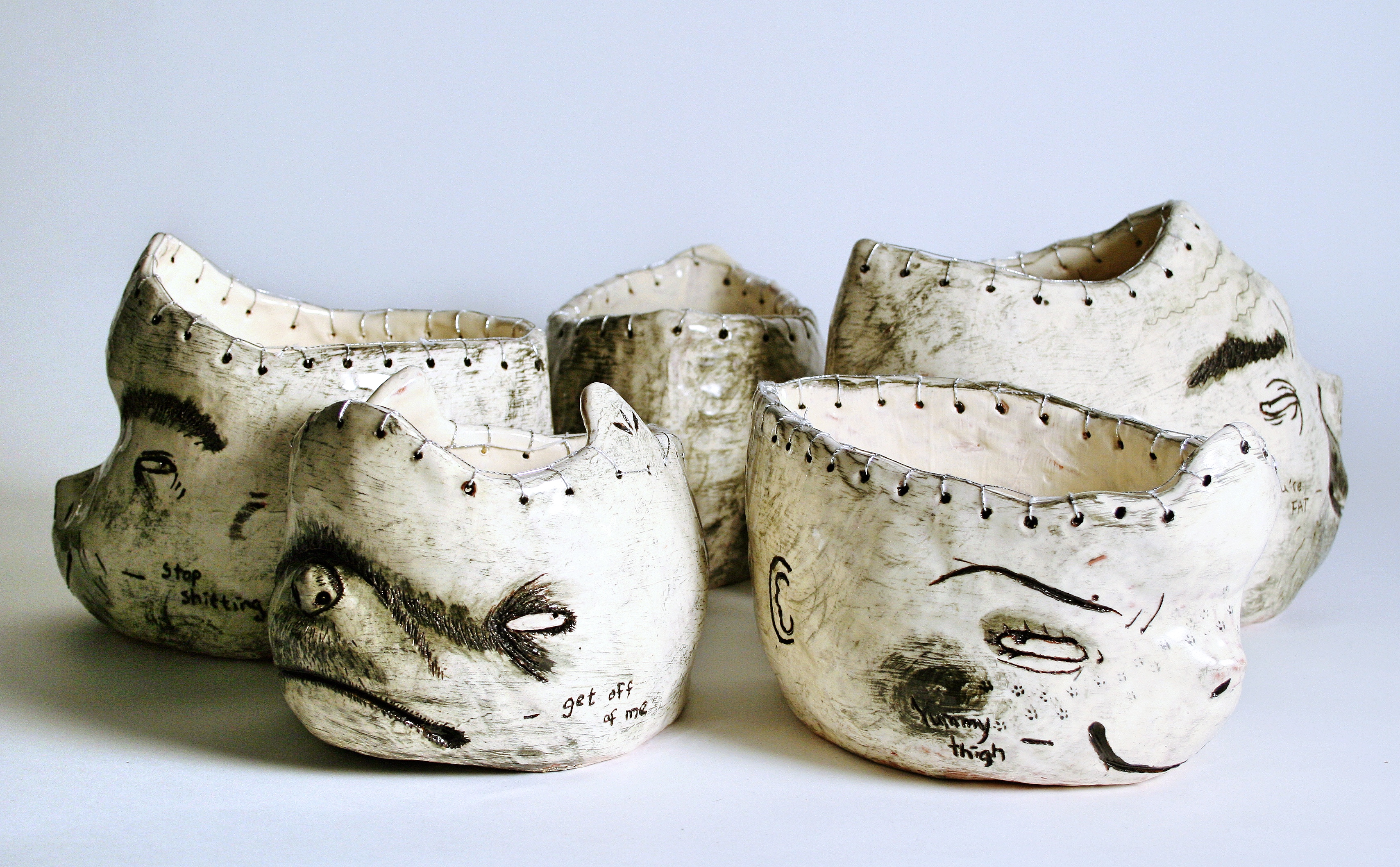 Tsang’s artworks are a reflection of her life experiences, and examine her struggles with the past and the present. Her sculptures are as heavy in emotion as they are in physical form. Through her masterful understanding of ceramic media, and the intimate approach to the illustrative line work found across her body of artwork, Tsang is able to capture a nuanced understanding of how to merge seemingly disparate emotions and thoughts. These artworks act as a tool of survival, and she encourages the viewer to take a good look at ourselves, to identify, pick up, eat, feel, live with, digest, and become a part of our pain.